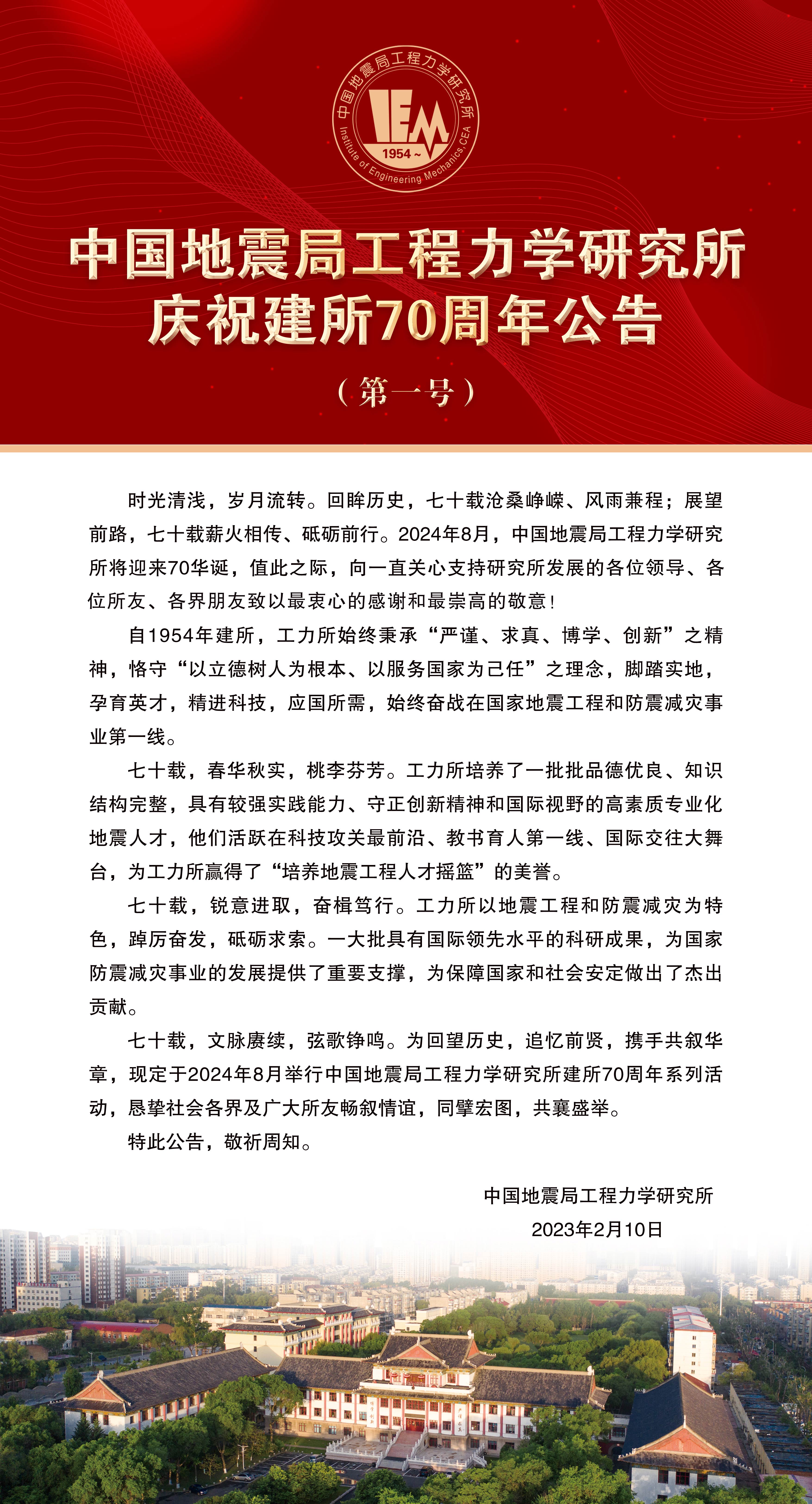 中國地震局工程力學(xué)研究所慶祝建所70周年公告(第一號)