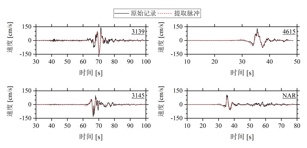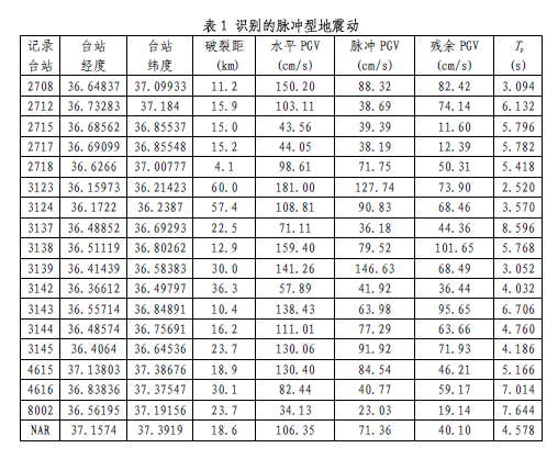 利用強(qiáng)震動(dòng)觀測(cè)記錄識(shí)別了此次地震中近斷層地震動(dòng)是否存在速度脈沖效應(yīng)。結(jié)果顯示,公開發(fā)布的18組強(qiáng)震動(dòng)記錄是典型的脈沖型地震動(dòng)(見表1),部分脈沖記錄及提取的速度脈沖見圖2。