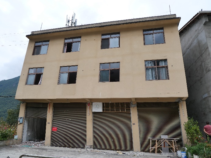 瀘定線科考組(曲哲、朱柏潔)主要考察了位于八度和九度區(qū)的磨西鎮(zhèn)典型建筑地震損傷情況,包括典型的隔振結(jié)構(gòu)、木結(jié)構(gòu)、底框結(jié)構(gòu)等。如甘孜某學(xué)校行政樓,為框架結(jié)構(gòu)底部隔震建筑,采用隔震支座附加油阻尼器的設(shè)計,在地震中上部結(jié)構(gòu)整體發(fā)生了平移,底部隔震層位移明顯,震后隔震支座完好,部分阻尼器損傷。杉樹鎮(zhèn)的底框結(jié)構(gòu),典型破壞特征為首層柱傾斜,上部磚墻交叉裂縫,一些非結(jié)構(gòu)構(gòu)件發(fā)生破壞。部分砌體結(jié)構(gòu)建設(shè)在山坡上,基礎(chǔ)局部失效,使得上部結(jié)構(gòu)震害較重。同時瀘定線科考組還前往燕子溝地震臺,查看了儀器情況。
