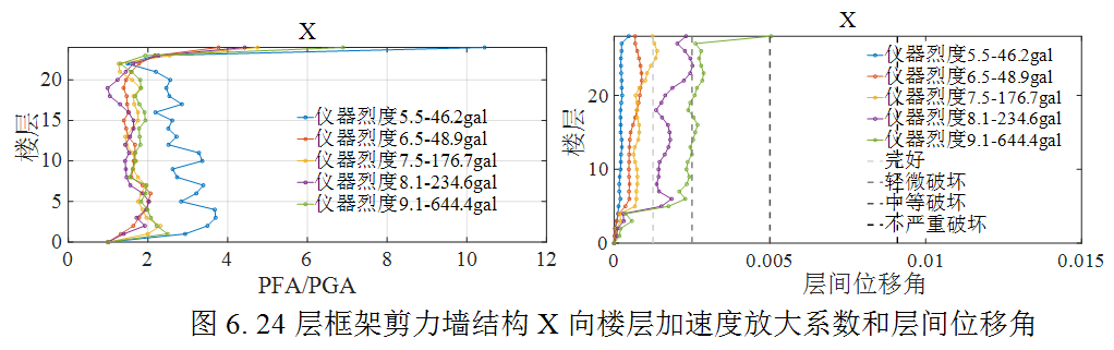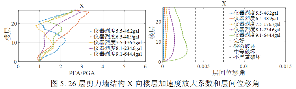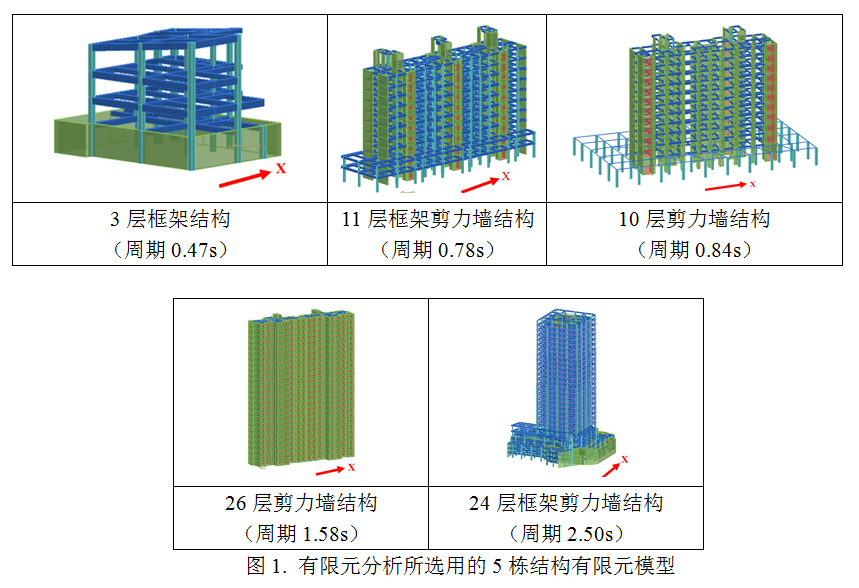 為評估結構在此次地震動的破壞水平,選取了實際記錄到的儀器烈度對應的5組強震記錄,開展了針對當地抗震設防烈度為8度0.2g的5棟典型鋼筋混凝土結構房屋的非線性動力響應時程分析。5棟結構包括1棟框架、2棟框剪及2棟剪力墻,結構基本周期從小到大分別是0.47s,0.78s,0.84s,1.5s和2.5s。分析主要給出了對結構安全和建筑內人員體感影響明顯的層間相對位移和樓層加速度響應結果。表2為選取的地震動記錄相關信息。圖1為選取的5棟結構的有限元模型示意圖,圖2至圖6為五棟結構的初步分析結果。