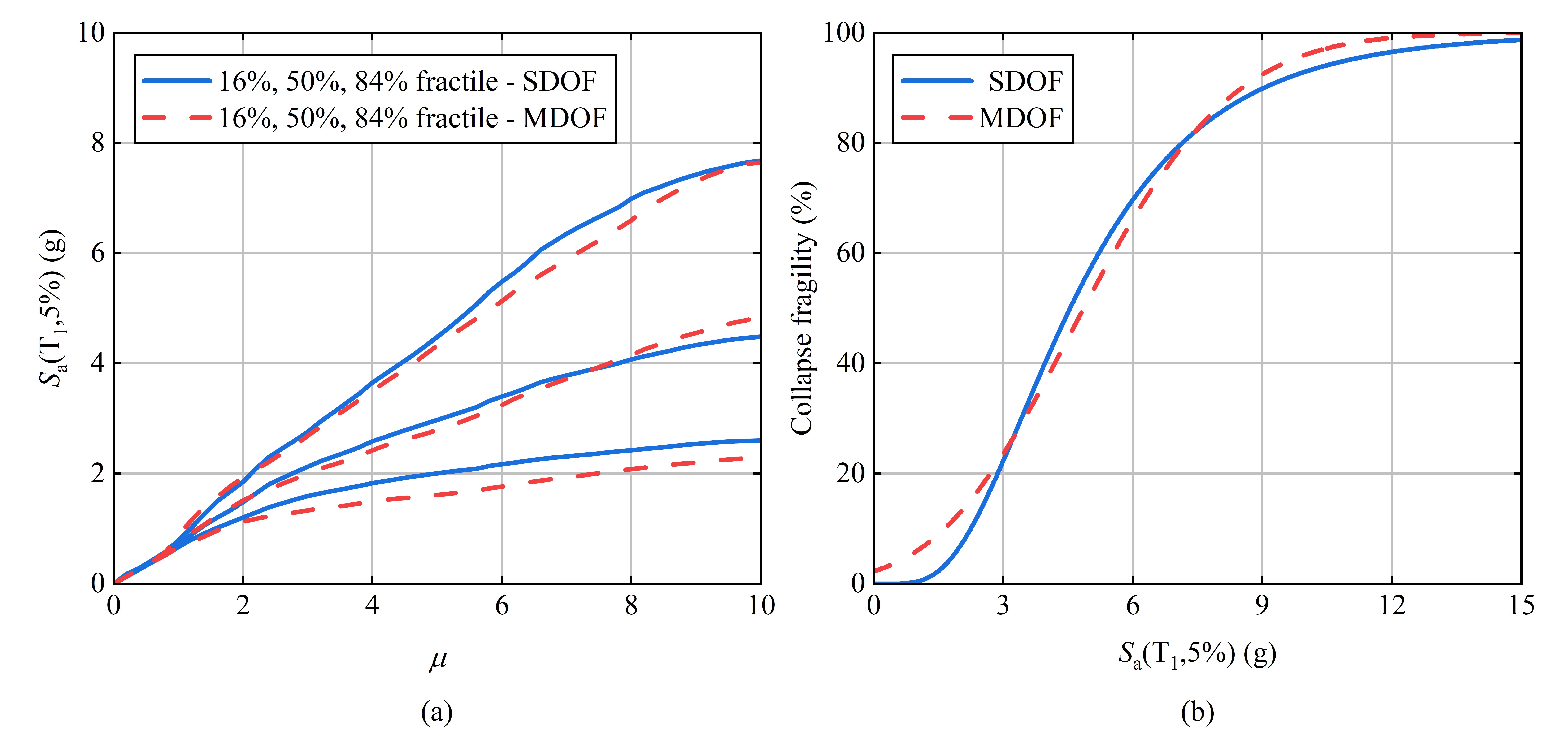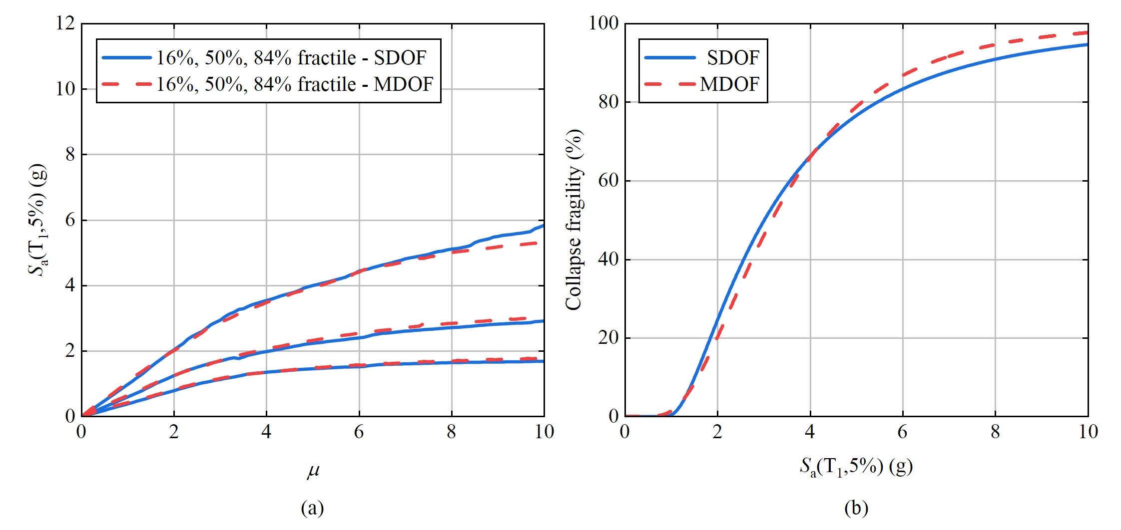 圖3 RC純框架結構(a)IDA曲線對比和(b)倒塌易損性曲線對比