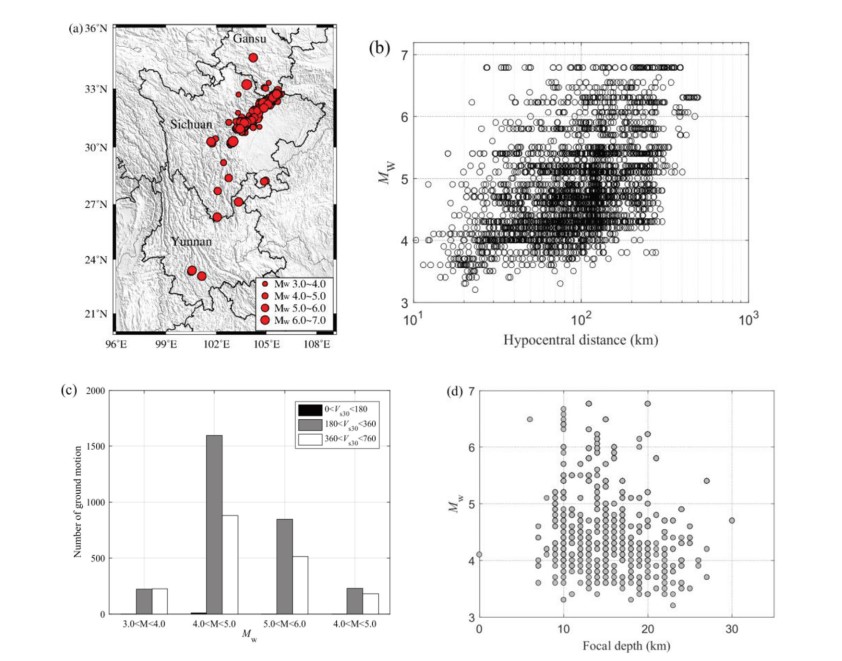 圖1 地震動數(shù)據(jù)分布 (a)地震的位置 (b)震源距和震級的關(guān)系