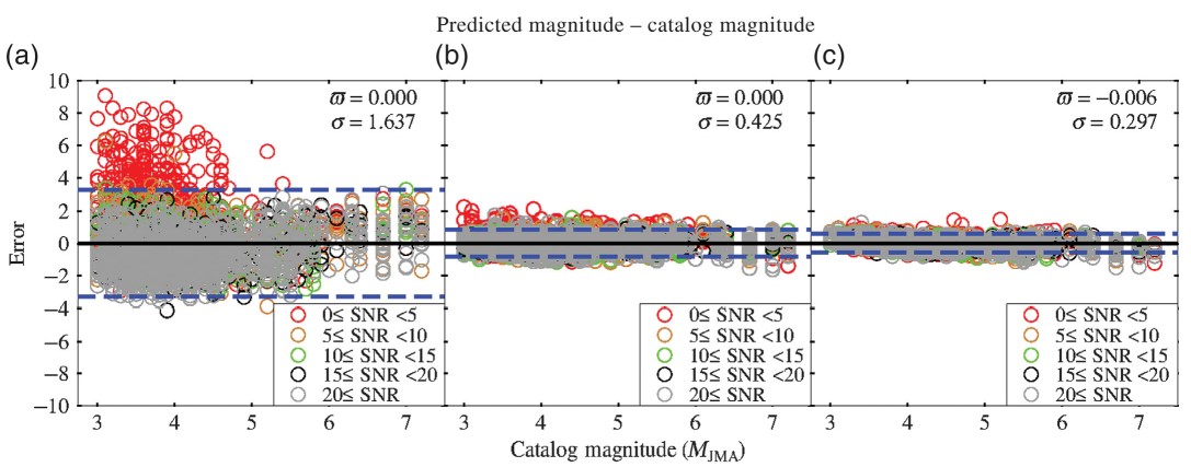 圖1 P波達(dá)到后3秒時(shí),(a)τc方法、(b)Pd方法和(c)SVM-M模型的震級(jí)估計(jì)誤差與震級(jí)和信噪比的關(guān)系