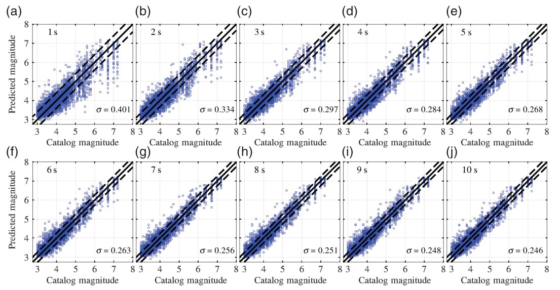 圖2 P波到達(dá)后1-10秒,基于SVM-M模型的單臺(tái)震級(jí)估計(jì)結(jié)果