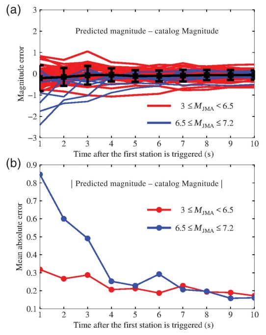 圖3 首臺(tái)觸發(fā)后,震級(jí)估計(jì)誤差與隨時(shí)間的演化