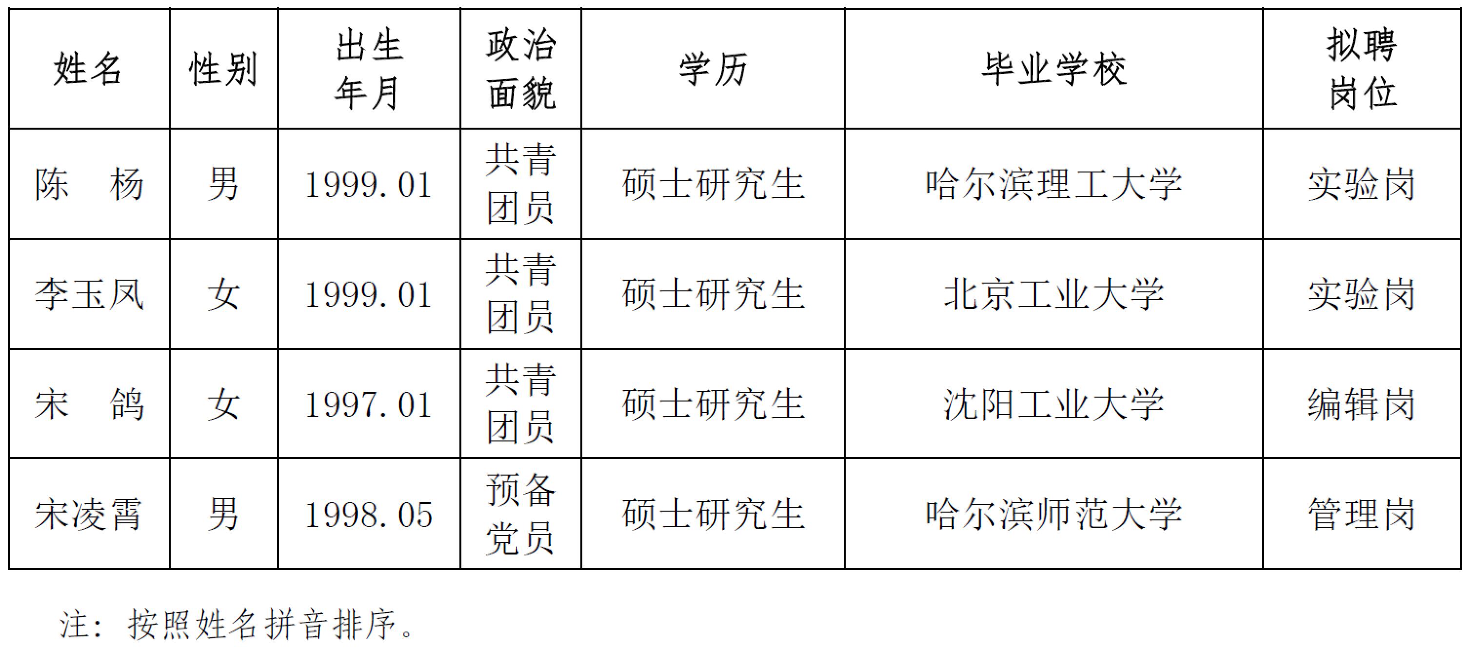 發(fā)布時間: 2024-05-14 點(diǎn)擊數(shù)量:17380根據(jù)中國地震局《關(guān)于貫徹執(zhí)行〈事業(yè)單位公開招聘人員暫行規(guī)定〉的通知》文件精神和我所用人計劃,經(jīng)公開發(fā)布招聘信息、資格審查、面試等程序確定擬錄人員?,F(xiàn)將擬錄人員相關(guān)情況公示如下,公示期7個工作日,期間如有異議請與中國地震局工程力學(xué)研究所人才資源部或紀(jì)檢室聯(lián)系,以個人名義反映情況的領(lǐng)署真實(shí)姓名,以單位名義反映情況的須加蓋公章。