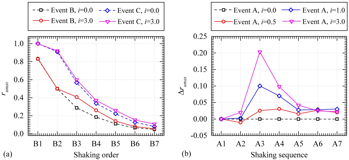 針對淺表層砂土的反復(fù)液化問題,開展了地震-孔隙滲流耦合作用下砂土液化的模型試驗(yàn),揭示了震后再固結(jié)階段向上的孔隙水滲流對淺表層砂土地基抗液化能力的影響?;谧灾餮兄频牡卣?滲流耦合作用試驗(yàn)裝置(圖1),研究了不同水力梯度、滲流時(shí)間、地震歷史作用下,淺表層砂土在連續(xù)地震作用下抗液化能力的演化規(guī)律。結(jié)果表明(圖2):(1)存在一定的水力梯度閾值,當(dāng)所施加的水力梯度大于該閾值時(shí),滲流作用會降低砂土抗液化能力,且降低程度隨著滲流時(shí)間的增長而增強(qiáng)。(2)隨著峰值地震加速度的增加,滲流作用對淺表層砂土地基抗液化能力的削弱程度呈先降低后增加的規(guī)律。(3)不同振次后的滲流作用對淺表層砂土抗液化能力的削弱作用不同,總體來說削弱程度隨模型地基密實(shí)度的提高而降低。